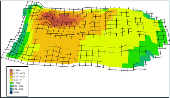 The resulting NDVI difference map highlights areas of both stability and improvement, with approximately 40% of the field showing increased and stable NDVI values (yellow to blue regions). These areas suggest a positive early response to the newly adopted management practices. Other regions with minimal or slightly reduced NDVI values may reflect natural field variability or transitional responses during the first year of implementation.