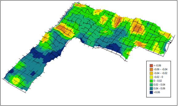 The resulting NDVI difference map shows a positive trend, with many areas in the field exhibiting stable or increased NDVI values (Blue color). These improvements indicate an encouraging early response to the new management practices implemented in 2024. Visual assessment suggests that approximately 80% of the field area (green to blue regions) showed improved NDVI, reflecting enhanced crop vigor and canopy development. Some zones with slight declines may reflect field variability or localized conditions.