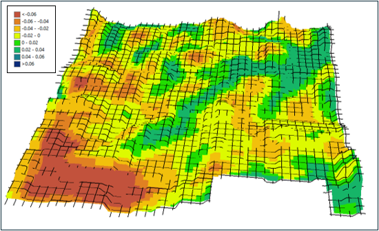 The resulting NDVI difference map highlights areas of both stability and improvement, with approximately 40% of the field showing increased NDVI values (green to blue regions). These areas suggest a positive early response to the newly adopted management practices. Other regions with minimal or slightly reduced NDVI values may reflect natural field variability or transitional responses during the first year of implementation.