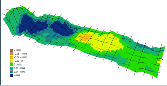 The resulting NDVI difference map shows a positive trend, with many areas in the field exhibiting stable or increased NDVI values (Blue color). These improvements indicate an encouraging early response to the new management practices implemented in 2024. Visual assessment suggests that approximately 80% of the field area (green to blue regions) showed improved NDVI, reflecting enhanced crop vigor and canopy development. Some zones with slight declines may reflect field variability or localized conditions.