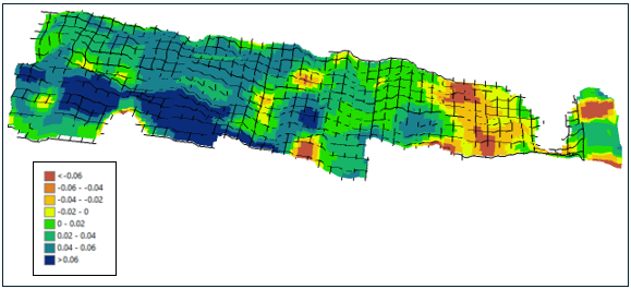 The resulting NDVI difference map shows a positive trend, with many areas in the field exhibiting stable or increased NDVI values (Blue color). These improvements indicate an encouraging early response to the new management practices implemented in 2024. Visual assessment suggests that approximately 65% of the field area (green to blue regions) showed improved NDVI, reflecting enhanced crop vigor and canopy development. Some zones with slight declines may reflect field variability or localized conditions.