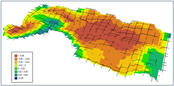 The resulting NDVI difference map highlights areas of both stability and improvement, with a substantial portion approximately 25% of the field showing increased NDVI values (green to blue regions). These areas suggest a positive early response to the newly adopted management practices. Other regions with minimal or slightly reduced NDVI values may reflect natural field variability or transitional responses during the first year of implementation.