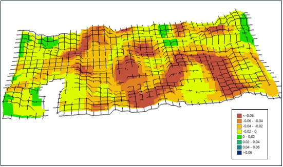 The resulting NDVI difference map highlights areas of both stability and improvement, with a substantial portion approximately 15% of the field showing increased NDVI values (green to blue regions). These areas suggest a positive early response to the newly adopted management practices. Other regions with minimal or slightly reduced NDVI values may reflect natural field variability or transitional responses during the first year of implementation.