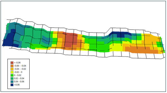 The resulting NDVI difference map shows a positive trend, with many areas in the field exhibiting stable or increased NDVI values (Blue color). These improvements indicate an encouraging early response to the new management practices implemented in 2024. Visual assessment suggests that approximately 50% of the field area (green to blue regions) showed improved NDVI, reflecting enhanced crop vigor and canopy development. Some zones with slight declines may reflect field variability or localized conditions.