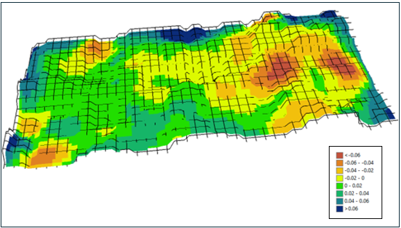 The resulting NDVI difference map shows a positive trend, with many areas in the field exhibiting stable or increased NDVI values (Blue color). These improvements indicate an encouraging early response to the new management practices implemented in 2024. Visual assessment suggests that approximately 55% of the field area (green to blue regions) showed improved NDVI, reflecting enhanced crop vigor and canopy development. Some zones with slight declines may reflect field variability or localized conditions.