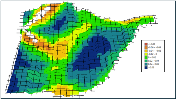 The resulting NDVI difference map shows a positive trend, with many areas in the field exhibiting stable or increased NDVI values (Blue color). These improvements indicate an encouraging early response to the new management practices implemented in 2024. Visual assessment suggests that approximately 70% of the field area (green to blue regions) showed improved NDVI, reflecting enhanced crop vigor and canopy development. Some zones with slight declines may reflect field variability or localized conditions.
