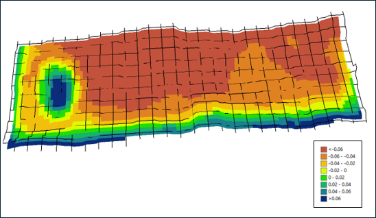 The resulting NDVI difference map highlights areas of both stability and improvement, with a substantial portion approximately 20% of the field showing increased NDVI values (green to blue regions). These areas suggest a positive early response to the newly adopted management practices. Other regions with minimal or slightly reduced NDVI values may reflect natural field variability or transitional responses during the first year of implementation.