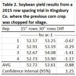 On average, the 15” rows yielded no different than the estimated yield of those same strips if they would have been 30” rows (Table 2). This estimate was calculated from data surrounding both sides of each strip. These findings were in agreement with a nearby trial in 2015 where previous corn stover was also returned. However, in another 2015 nearby row spacing trial where the field was previously chopped for silage, there was a significant 3 bu ac-1 advantage with 30” rows. On-farm row spacing trials comparing previous residue management practices may be of interest in the future.